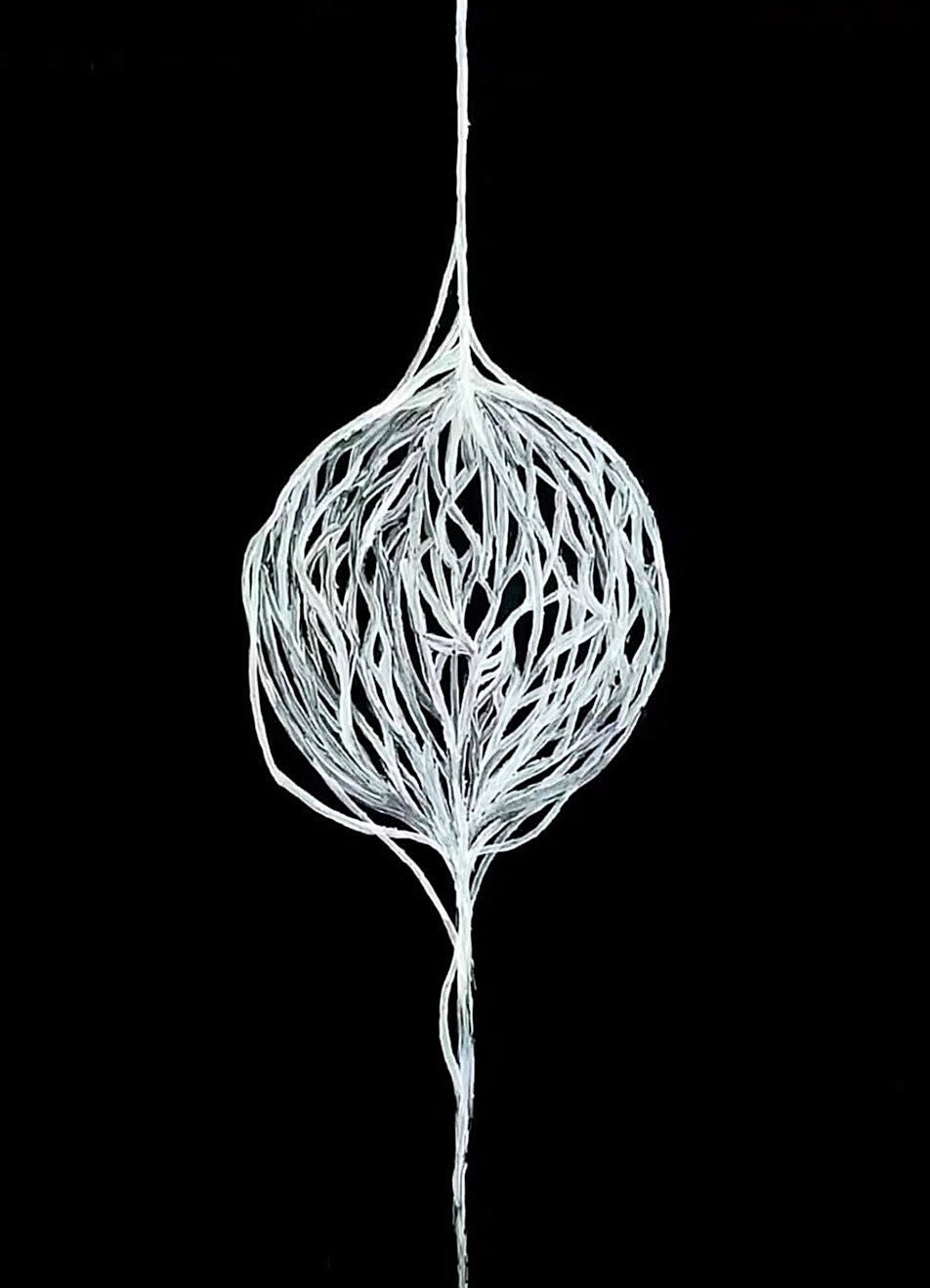 Czarna przestrzeń wyciąga pionowe linie, w których sercu rodzą się kuliste formy. Wszystko jest wstrzymane – ani poruszenia, ani upadku. To punkt, w którym potencjał spotyka ograniczenie.