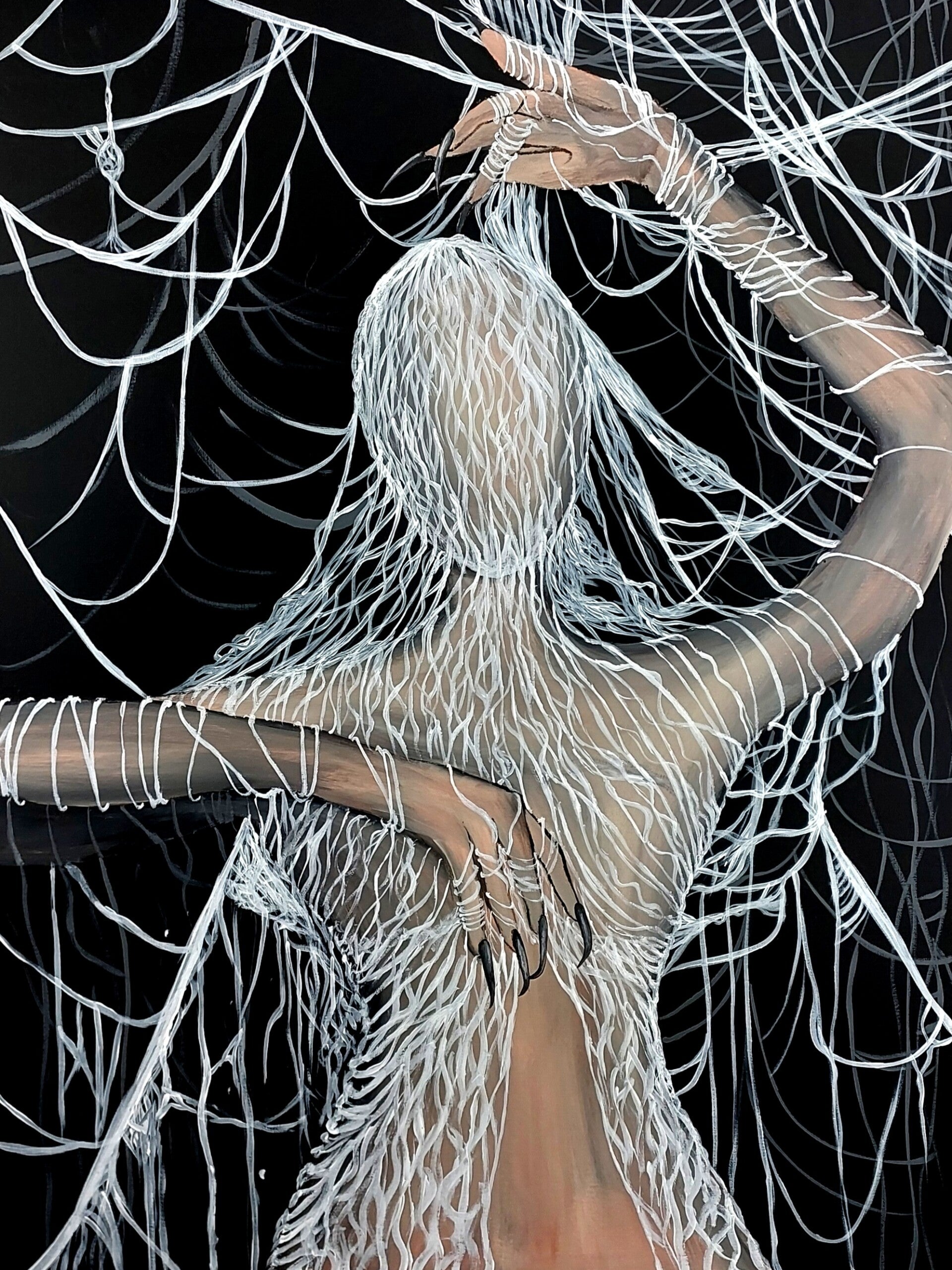 Postać cała owinięta nicią, unosi ręce jak baletnica w zamrożonym rytmie. Pajęczyny oplatają ją i tło, tworząc połączenie cielesności i abstrakcji, ruchu i zatrzymania. Każdy gest jest dialogiem z przestrzenią – taniec w niewidzialnej sieci, który mówi: „istnieję, choć granice mnie oplatają